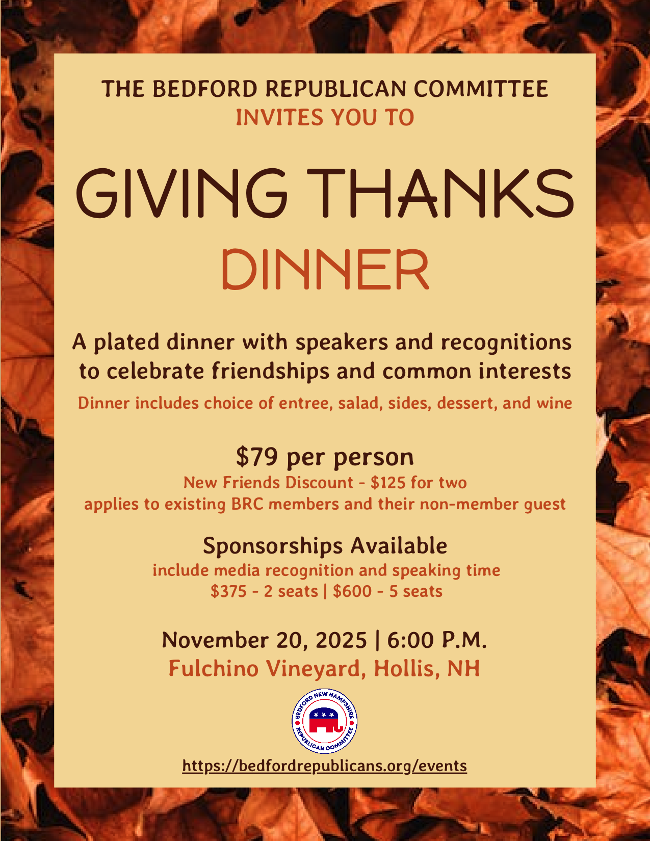 The Bedford Republican Committee will host a “Giving Thanks” Dinner on Thursday, November 20, 2025 from 6:30 PM – 8:30 PM at Fulchino’s Winery, 187 Pine Hill Road, Hollis, NH 03049.